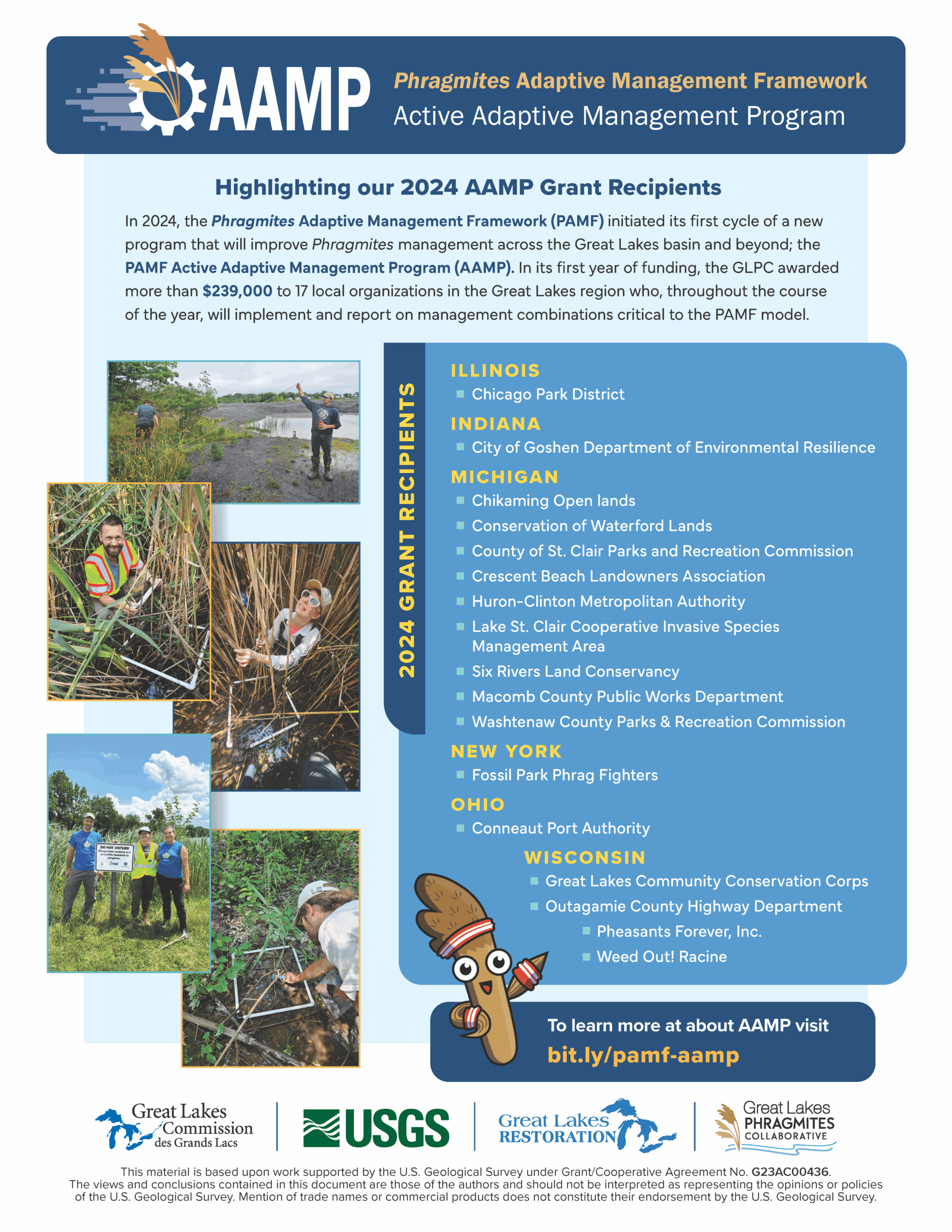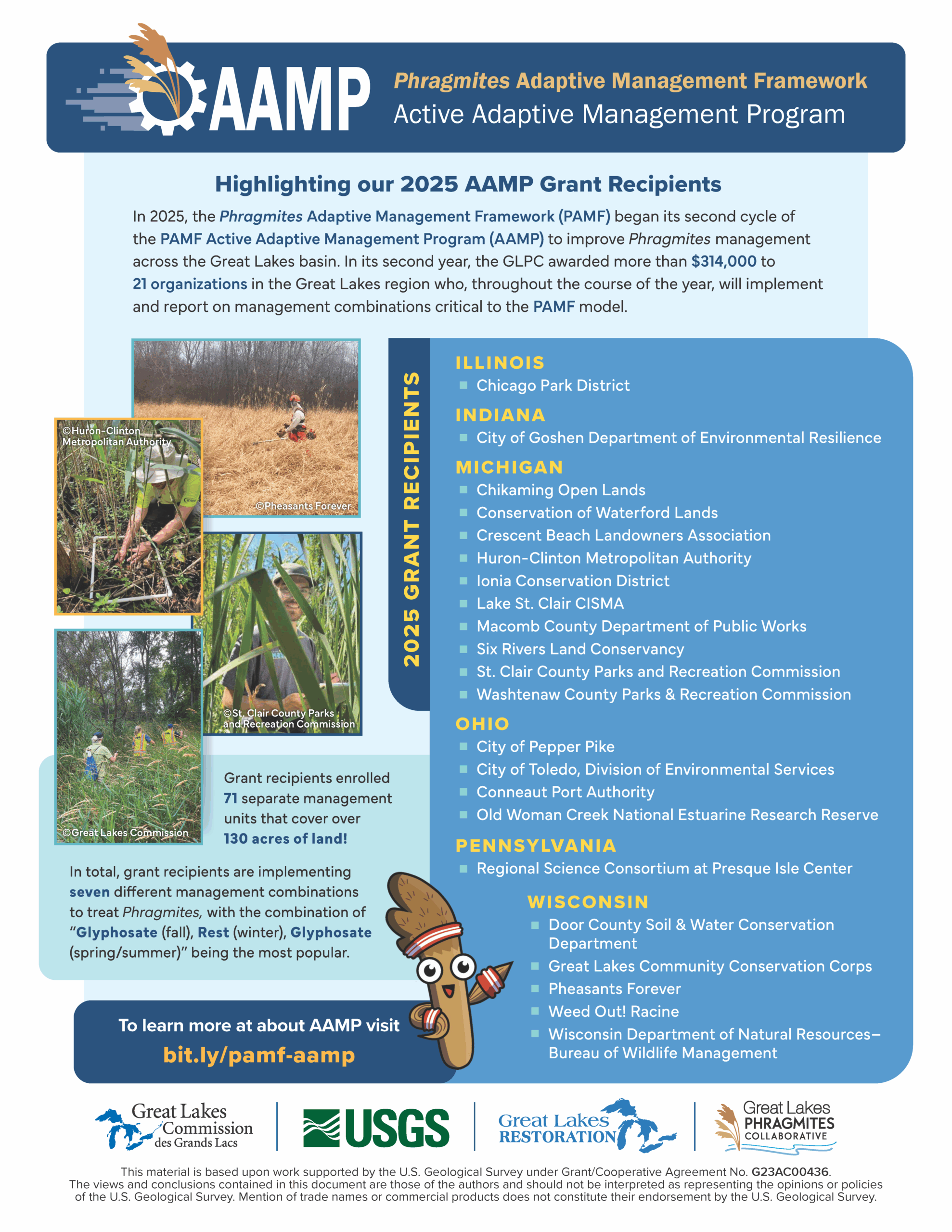 The funding opportunity will be the best fit for managers within the U.S.-side of Great Lakes basin who are looking for limited funding to manage non-native Phragmites using one or more of the 12 priority management combinations (see the “What is AAMP” drop down above). Successful proposals will include plans to manage at least one discrete stand of Phragmites and submit associated monitoring and management data using established PAMF protocols. Other general selection criteria includes: